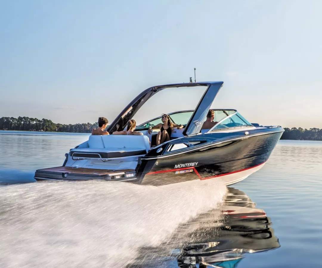 328SS的船身线条设计简约锐利,凌厉动感的视觉效果,真切展现蒙特利超级运动艇硬朗动感的美式风范!300匹马力的水星双引擎让TA行驶之间犹如脱缰之马,锋芒毕露,由内而外焕发年轻动感的强大吸睛气场,强劲的推背感更是让人难以抵御!黑色简约、科技感十足的驾驶台则让驾驶欲望一触即发。
