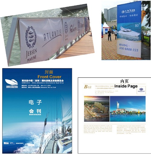 主要合作项目有: SIBEX品牌活动冠名; SIBEX展会指定产品赞助; SIBEX平台广告: ● 电子会刊 ● 展前预览 ● 参观门票 ● VIP请柬 ● 展区附近路边旗 ● 主通道广告牌 ● 展场三角广告牌 ● 码头通道横幅 ● 护栏喷绘广告 ● 游艇展胸卡 ● 环保手提袋 ● 地贴广告等