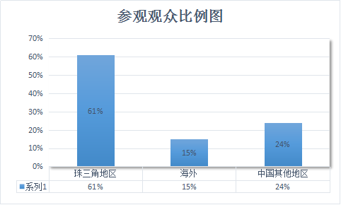 根据会展信息服务机构昆仑亿发的统计数据,本次展会由于中间阴雨天气的影响,观众有所减少,共12000人次到场参观,但高素质的专业观众和买家达4500人,占38.5%,比例高居国内第一。海外观众有1800人,包括法国参观团、意大利参观团、澳大利亚参观团,香港及澳门参观团等,其中意大利驻广州总领事出席了开幕式。参观观众有61%来自珠三角地区,15%来自海外,24%来自中国其他地区。