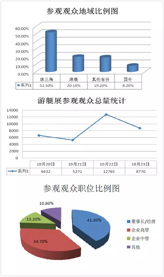 二、观众统计分析 本次展会期间,天高气爽,大批市民涌入游艇会,争睹这场奢华的盛宴。其中周六、周日参观人数达到顶峰,两天均有超过一万人次入场。由于游艇浮桥较窄,水上展区的保安全天均拉起封锁线,严格控制人流。