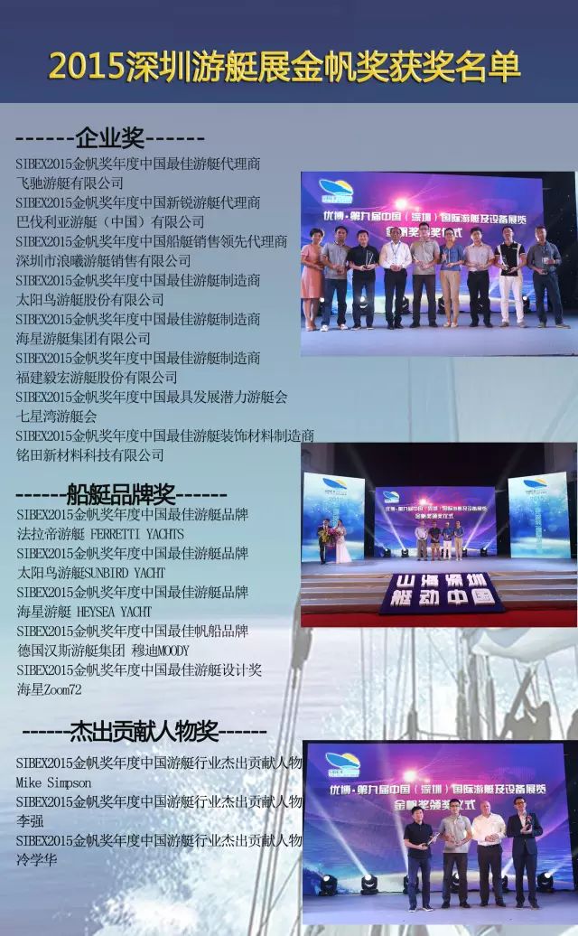2015年第九届SIBEX展后报告2015年第九届中国(深圳)国际游艇及设备展览会展后报告优博·第九届中国(深圳)国际游艇及设备展览会(SIBEX2015)于10月25日在大鹏新区七星湾游艇会圆满落幕。展会为期4天,采用国际上最受欢迎的水陆并展的模式,云集了国内外众多最具代表性的知名品牌、经销商和制造企业,展出了国际上最新颖、最先进的游艇帆船、设备配件和服务体系等,期间举行国际商贸活动、“金帆奖”颁奖典礼和多种缤纷的水上活动等。