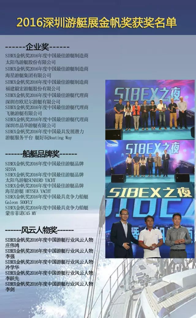 展会期间,不仅有多场行业内经贸洽谈活动,还举行SIBEX2016 “金帆奖”颁奖盛典,用以表彰和鼓励游艇行业和海洋生活有突出贡献的企业和个人。2016年,尽管受市场环境影响,但中国游艇产业依然涌现了一批优秀企业和先进人物。