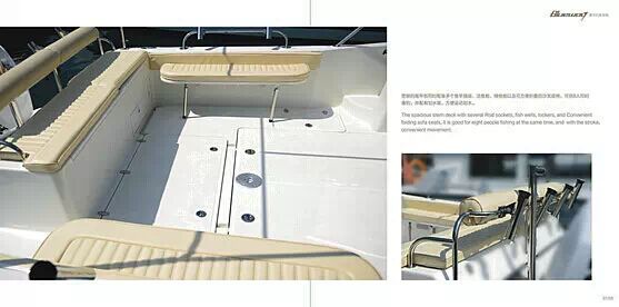 宽敞的尾甲板同时配备多个鱼竿插座、活鱼舱、储物舱以及可方便折叠的沙发座椅,可供8人同时垂钓。并配有划水架,方便运动划水。