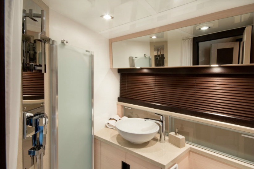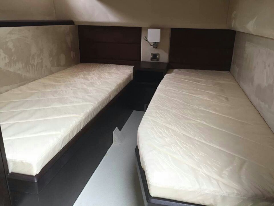 现船Galeon(卡帝尔) 420 Fly的下层甲板上,设计了一个豪华KTV房和两个房间,它们都拥有大量的净空高度。另外还有两个带淋浴的独立洗手间,确保舒适性和私密性。