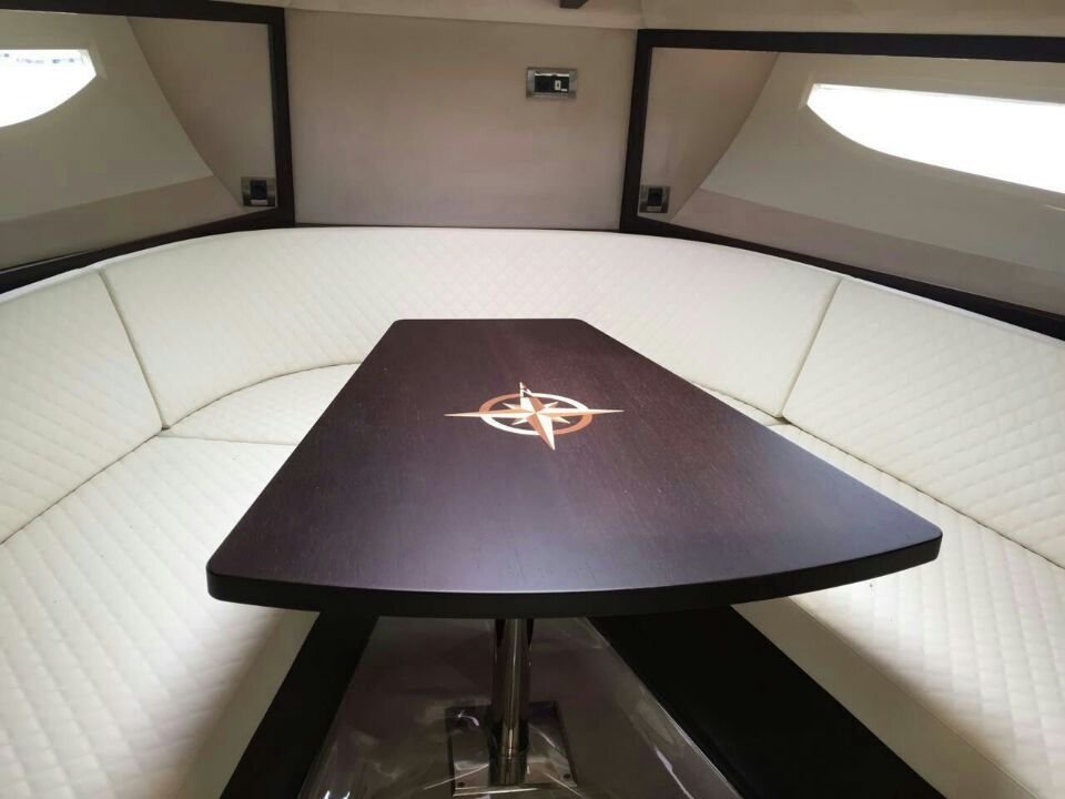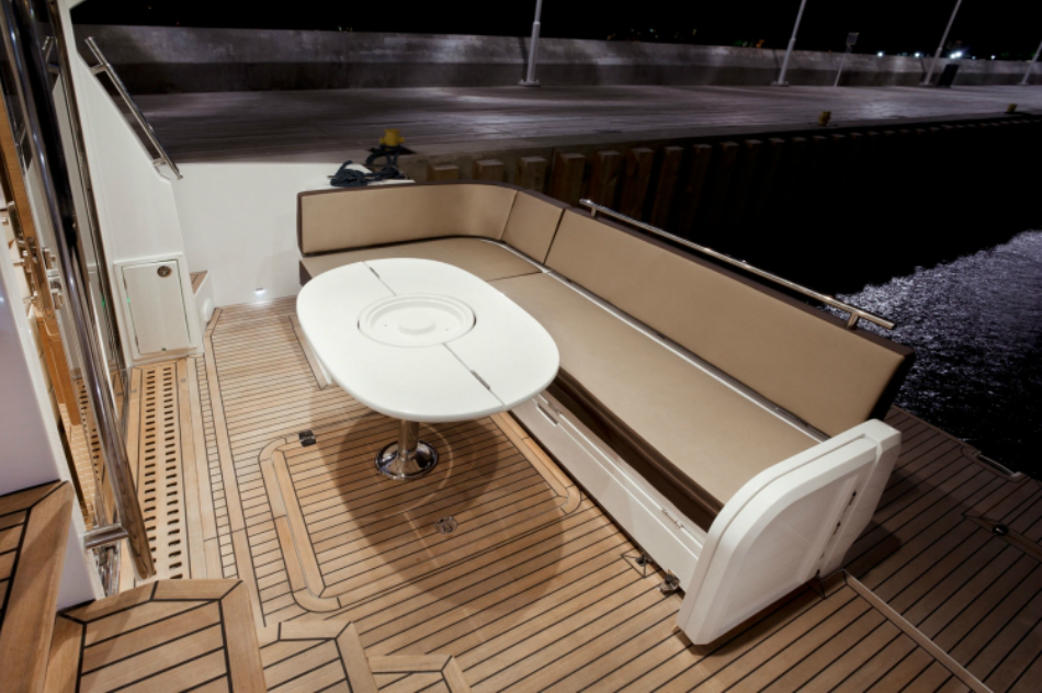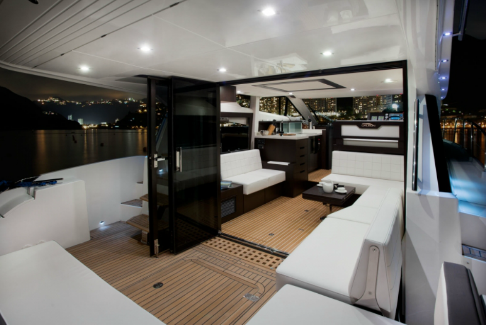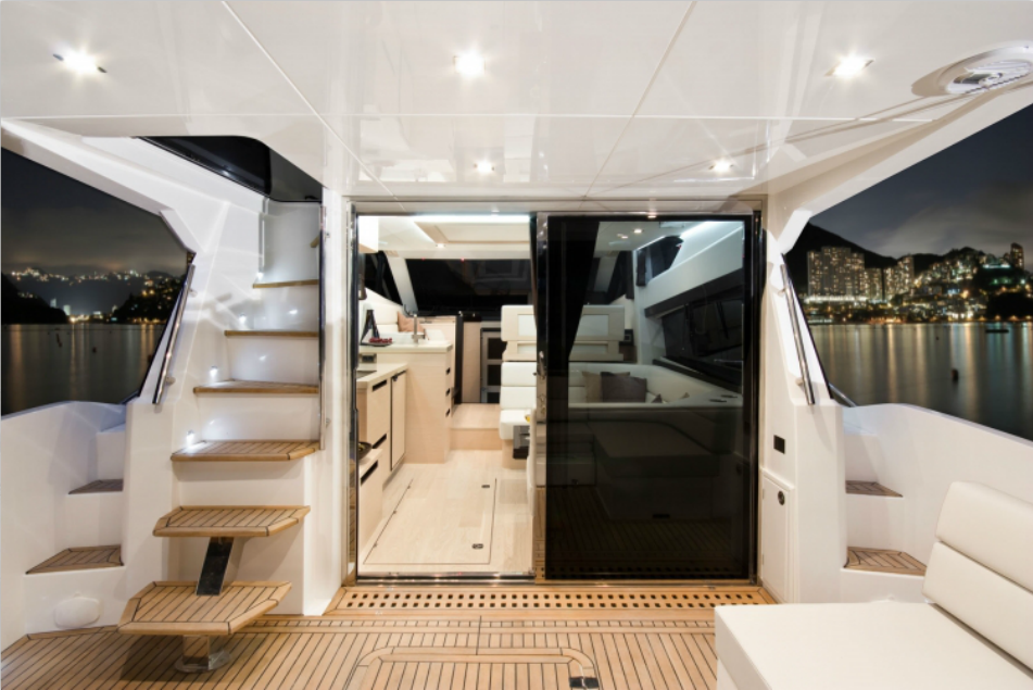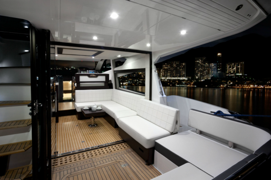 宽敞的主甲板上有餐桌、座椅、驾驶台,驾驶舱两边的电动舷窗使用方便。艉肼与沙龙中间仅隔着一道折叠门,完全打开折叠门,空间感瞬间倍增。客户可以选配加长型船尾游泳平台,用来存放各种水上运动设备,比如摩托艇,救生筏等等。