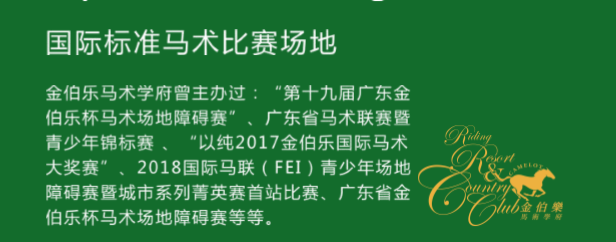 唯金伯乐马术俱乐部创立于2007年,座落于东莞长安镇,占地60万平方尺,是亚洲唯一的一所五星级马术学府,拥有奥林匹克标准室内及室外马术练习场地,更从世界各地引入优质纯种马匹,并附设高级会所设施,室内外游泳池、酒吧、瑜珈、KTV、网球场、舞厅等康体娱乐设施一应俱全。为崇尚运动的非凡一族,提供最理想的选择。